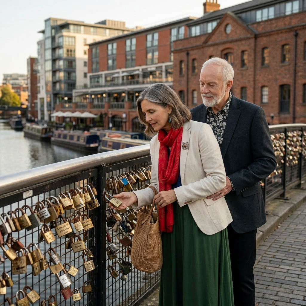 They emerge from the cafe into the Mailbox centre. James’s footsteps echo against the polished tile as they pass darkened storefronts, chairs still upturned on café tables. Olivia’s shoulder brushes his every few steps—accidental, then not. The air shifts as they emerge onto the footbridge, sunlight dancing across the murky canal water below. A metallic chorus of clicking sounds draws their attention to the railings where padlocks cluster like barnacles—heart-shaped, engraved, some orange with rust, others still gleaming with promises. Olivia’s fingers trace one that reads “Forever, T&S, 2006,” her nail catching on its corroded edge.