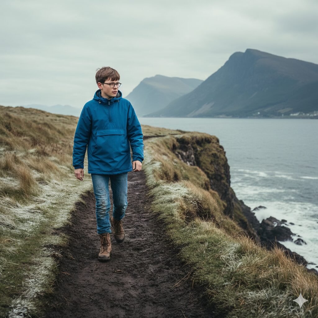 Dawn breaks as James laces his boots, the house silent around him. Outside, frost crunches beneath his feet. The cliff path stretches ahead—five miles of promise. Laura’s name beats in rhythm with his footsteps.
